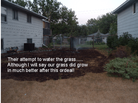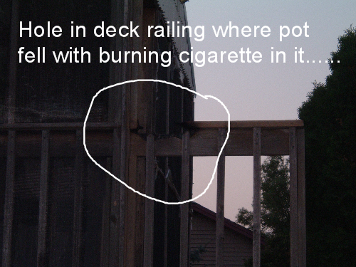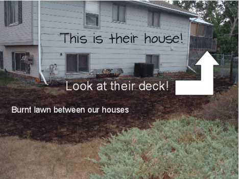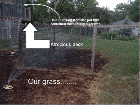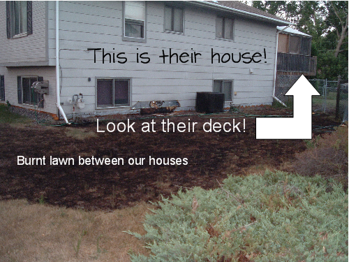 Last summer, while Punky and I were in IL visiting my family, Hubby called me to say that our lawn had been burnt by a fire that was started on the hillbilles’ deck. WHAT?!?? Apparently, on her way off to work, she had smoked a cigarette outside on the deck and threw it into an empty flower pot. The cigarette later reignited then fell off the deck and onto the grass…..which was VERY DRY due to our dry summer…..and up went the grass in flames. Thankfully, a guy driving down our street saw the flames, stopped, and sprayed the fire with a garden hose. He had most of it out by the time the fire engines arrived. Hubby promptly emailed me the following pictures (Although I have added in some notes to show you more clearly):