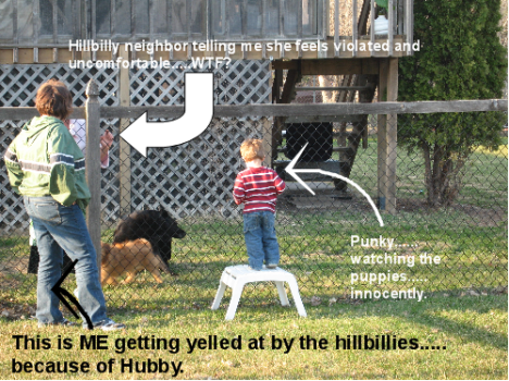 Apparently, sometime this spring, Hubby walked over to the fence……facing their deck, with his hands on his hips and shook his head in disgust. She was standing in her kitchen window which looks down where he was standing. She felt “violated, uncomfortable” and now she just doesn’t know what to think of us.