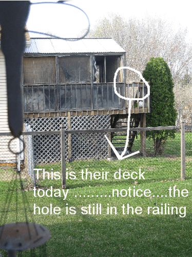 I promptly went in the house and told hubby he was a putz and that I had just been yelled at for his actions. He explained that yes, he had walked over there……..because he noticed besides the falling down screens, the mops, brooms, carpet rolls, and other trash in their “porch” the hole from the fire was still there….(they had just resided the whole house since the fire had burned some of their siding off, too) So, he shook his head and walked away.