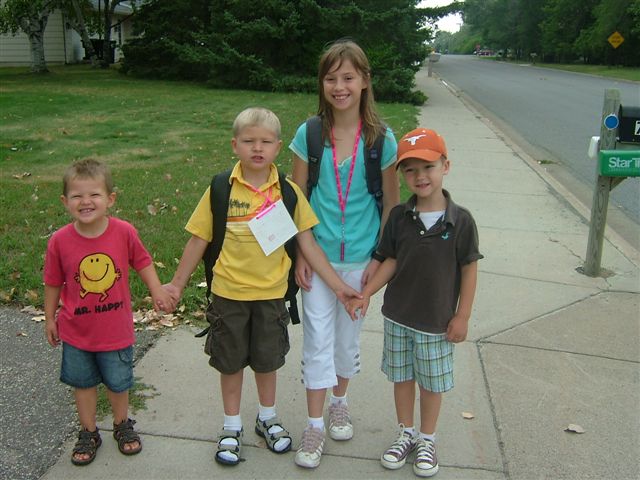 Punky (in red shirt, age 2) took his friends Corey and Kayla to the bus stop on the first day. Punky can’t wait until he goes to school…….Mommy can! 🙂 He is growing up so quickly!
