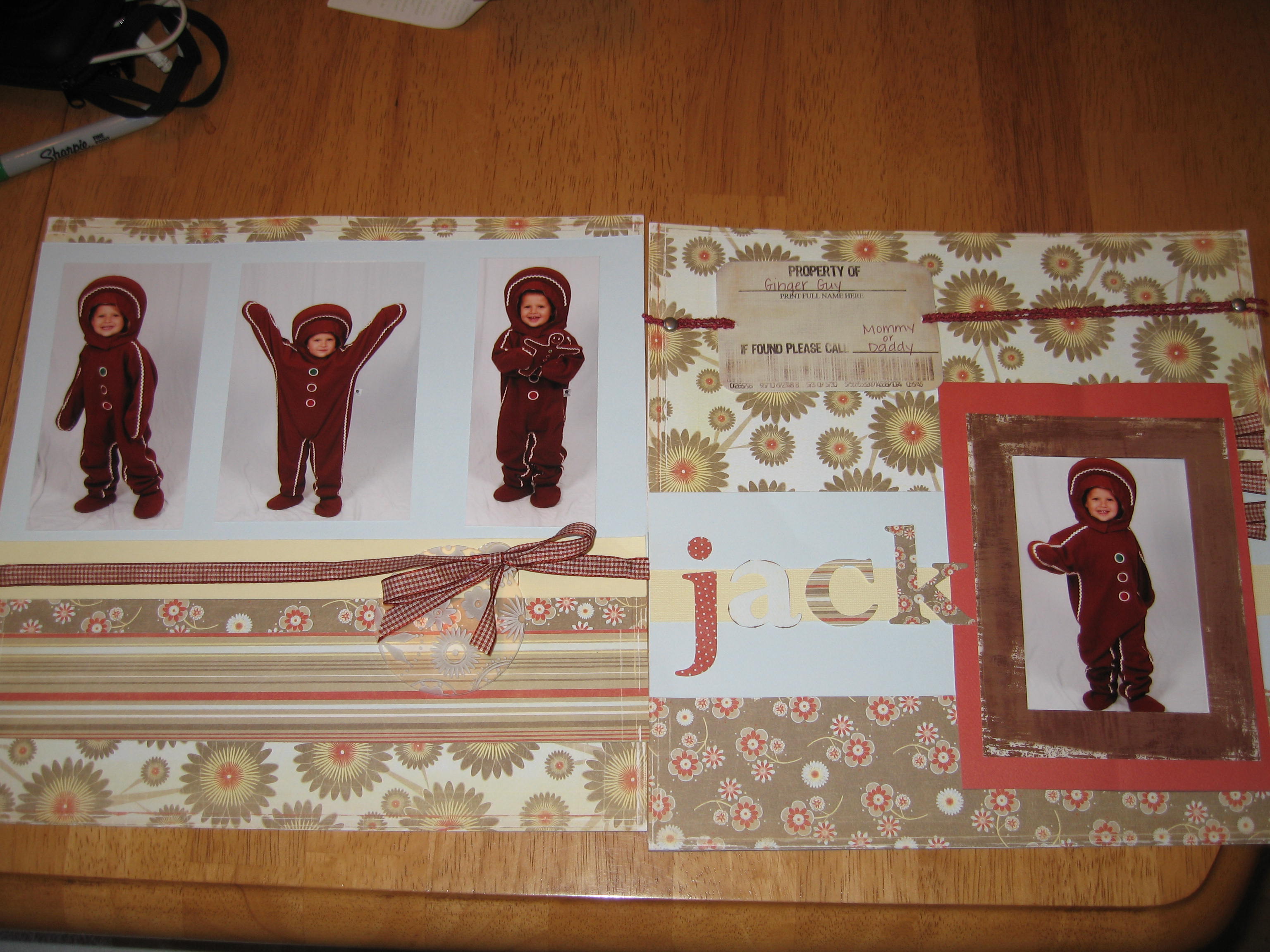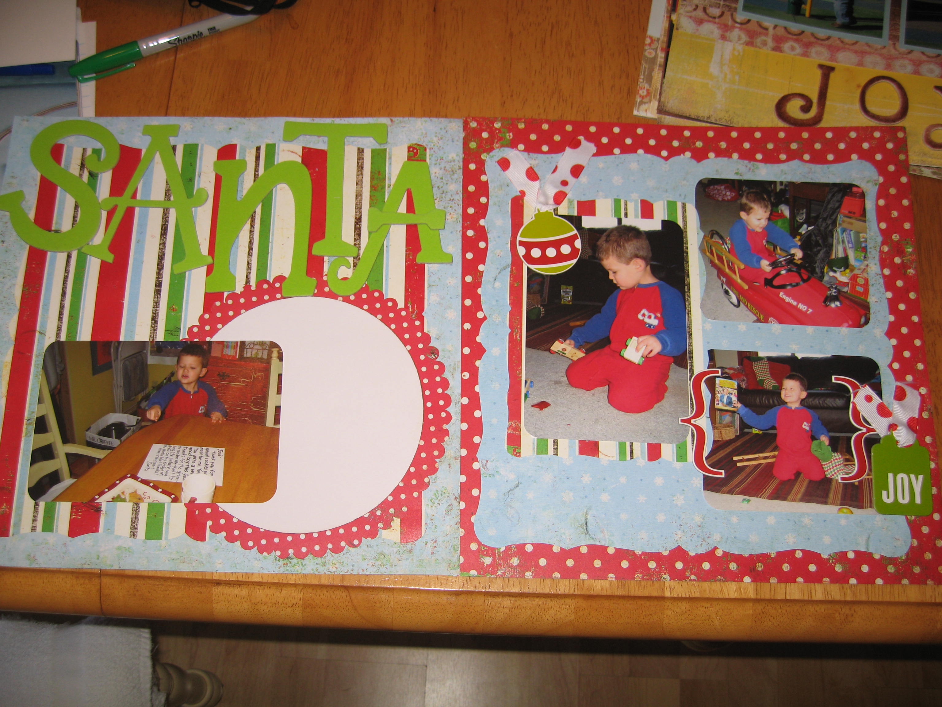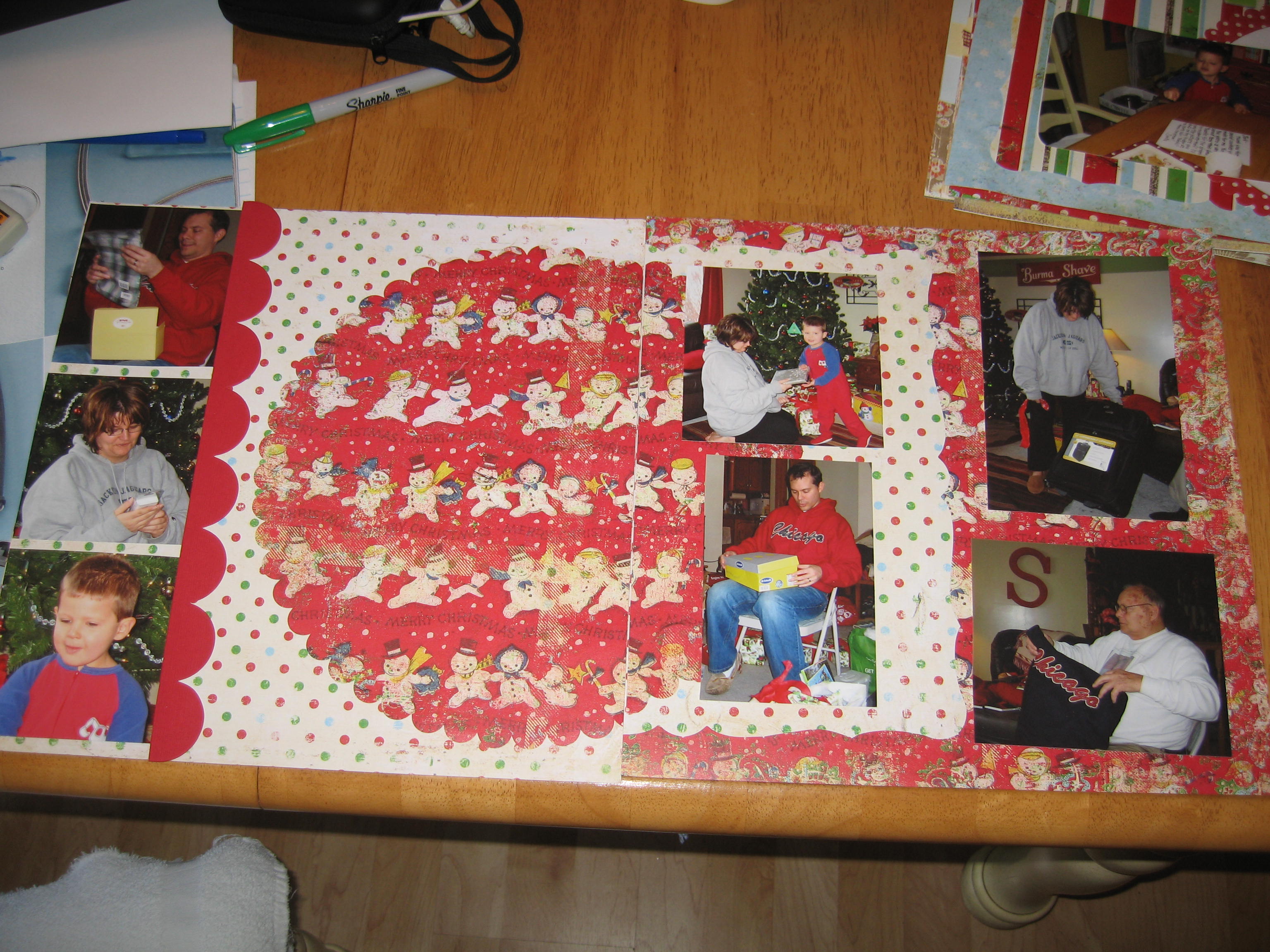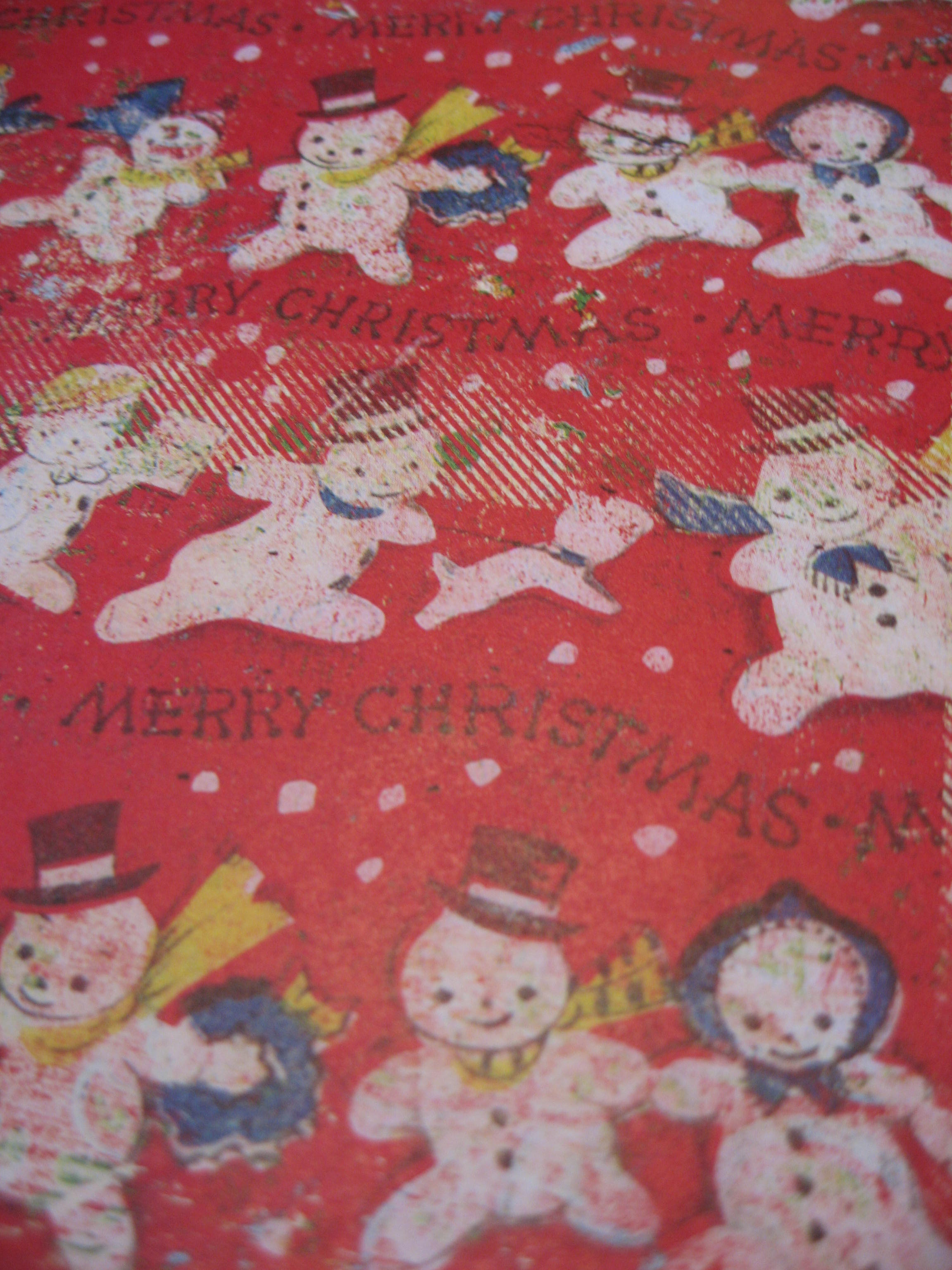 I like this spread; however, it needs lots of embellishing and a title/journal on that big red mat. BUT, check out the paper—–it reminds me of vintage Christmas wrapping paper…I love it!” Here’s a close up shot of the paper…