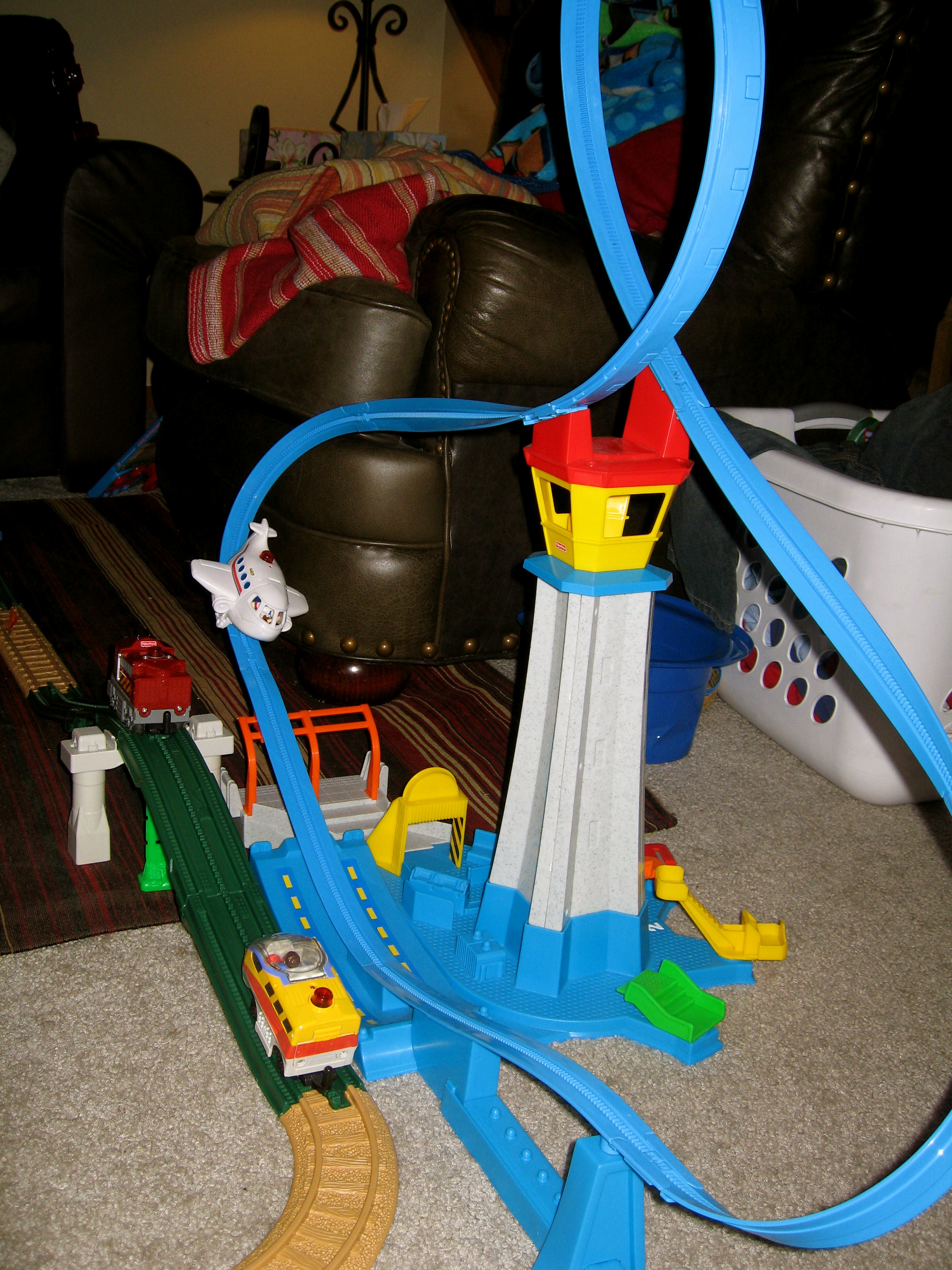 I don’t know how many of you are familiar with these. They really are very cool…and they lend themselves to great creativity with setting up “GeoTown.” The tracks just snap right together and you can create new layouts each time! Punky can even snap them into place. He usually asks Hubby or me to set up a layout; but then he has no qualms about switching tracks out to change the layout the way he wants it. 🙂 (Which I LOVE! This means someday, he’ll be building his own layouts!) Punky can play for quite awhile by himself with these sets. I like the remote control train sets, but Punky really enjoys the push cars too!