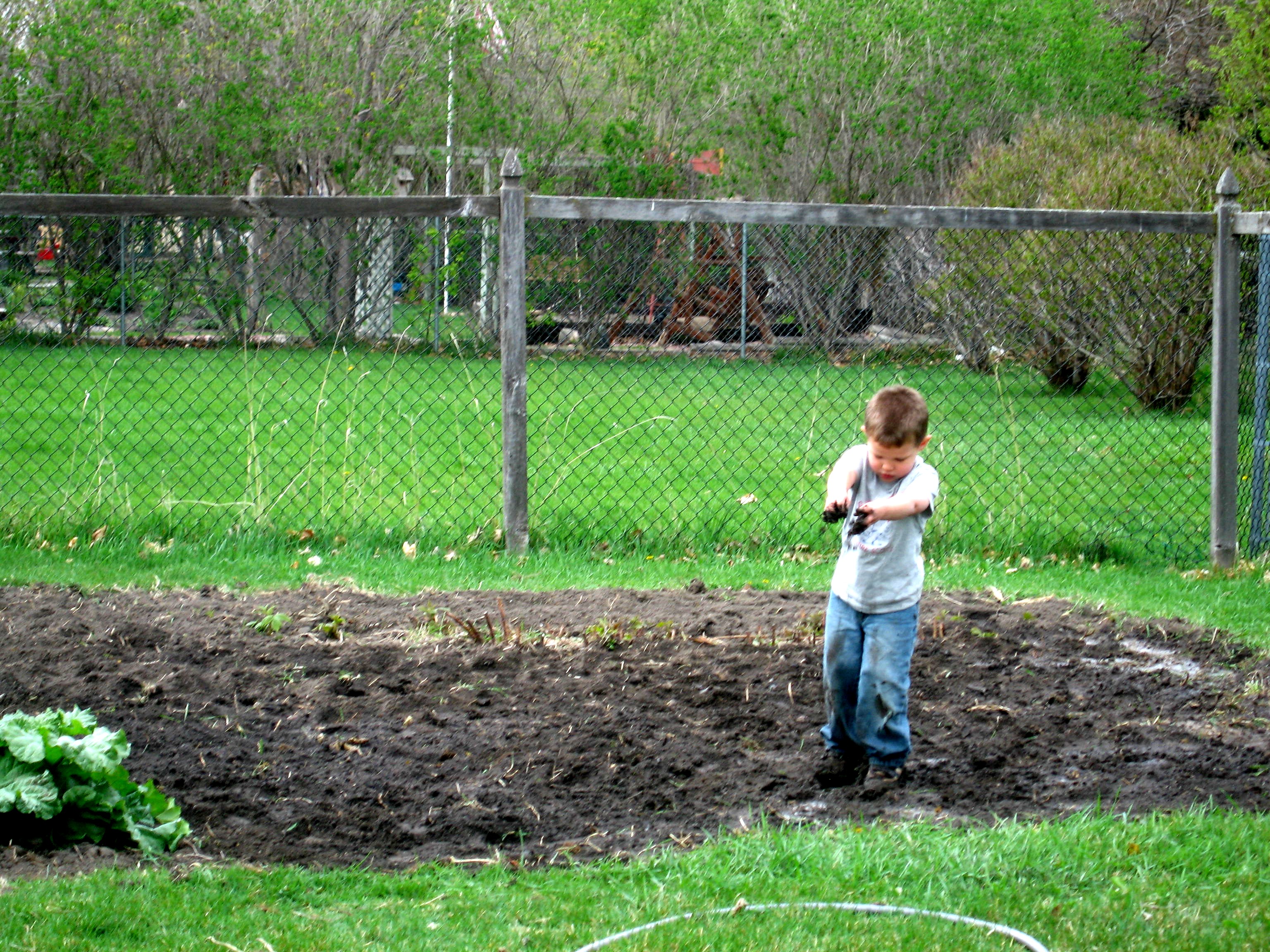 Punky had so much fun in the newly rototilled garden in our backyard. I gave the boy a hose, and away he went…creating a mess. He had so much fun!