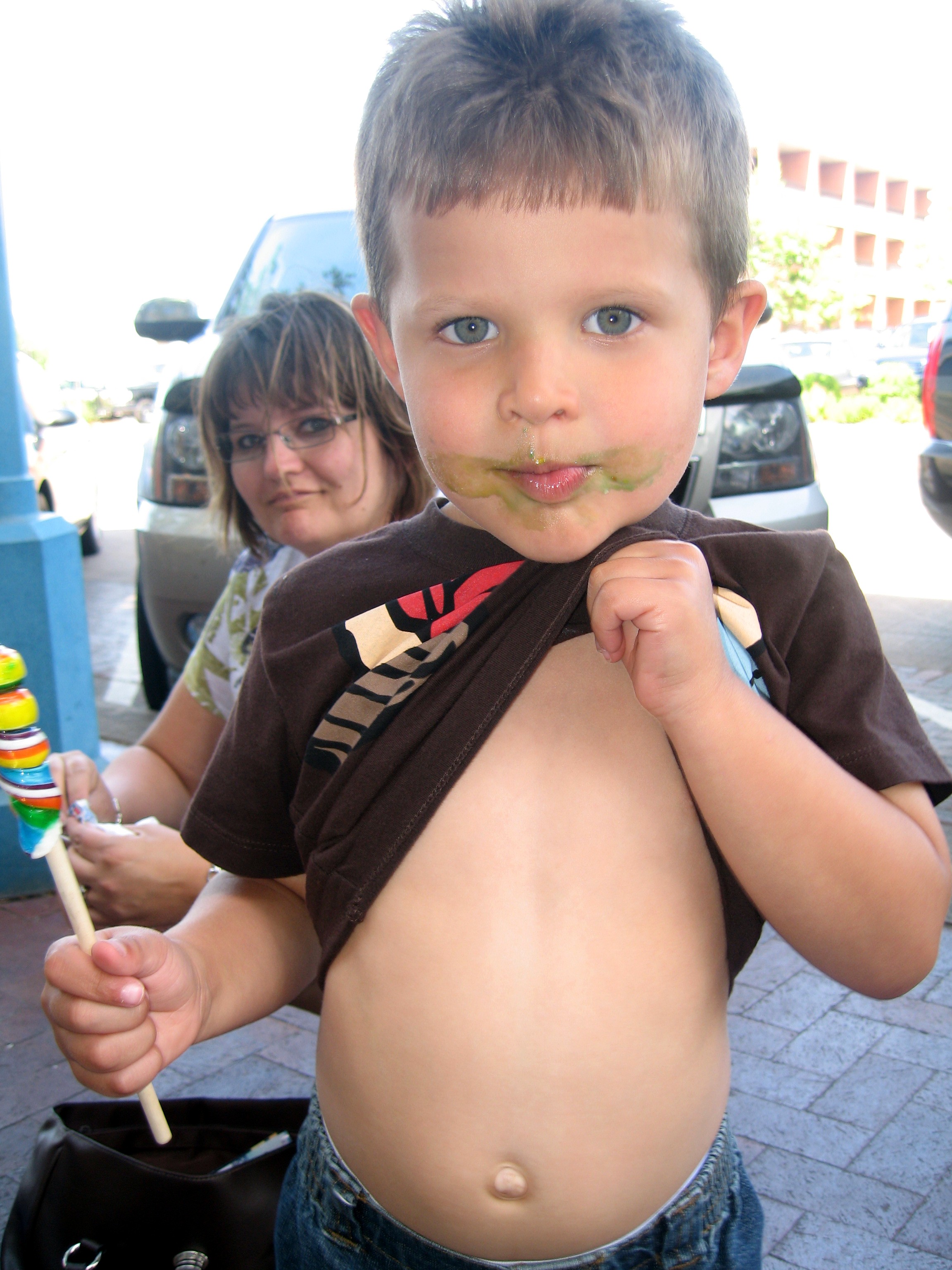 Punky showing Dada where his lollipop is going… right to his tummy!