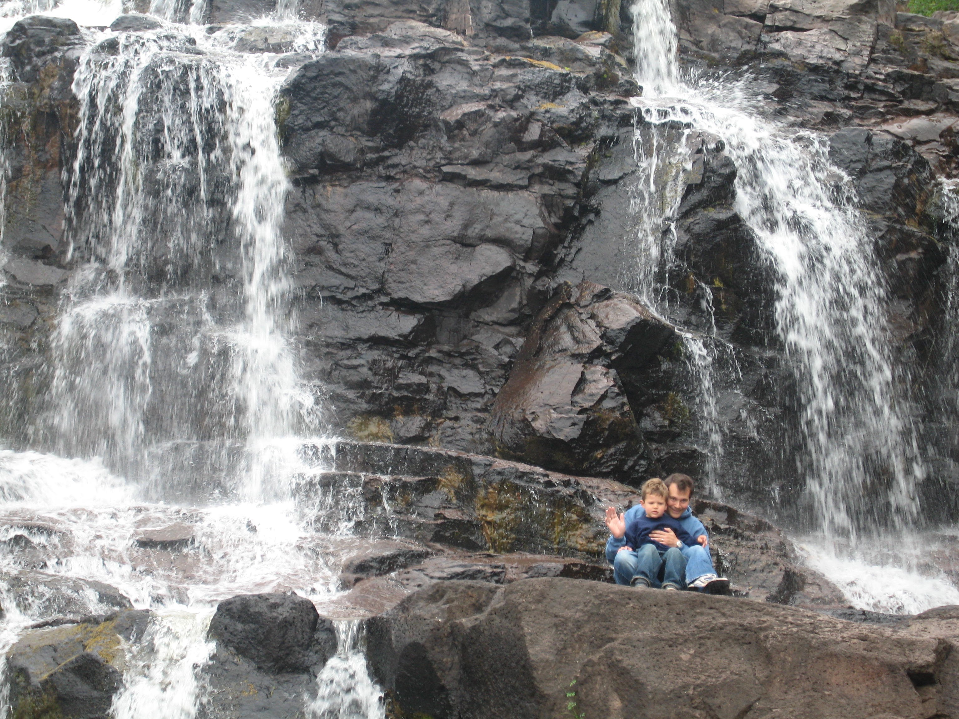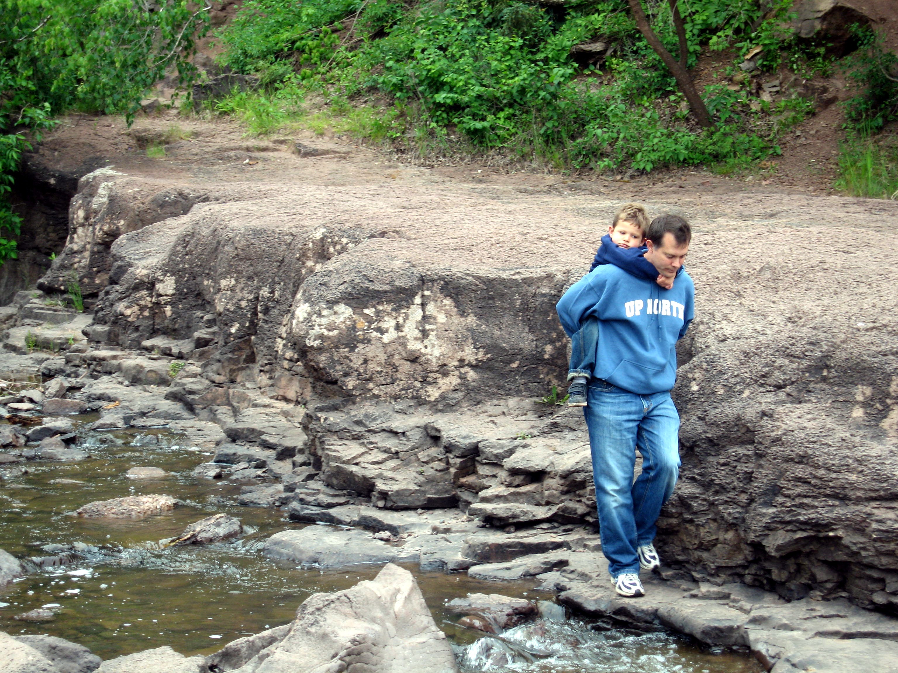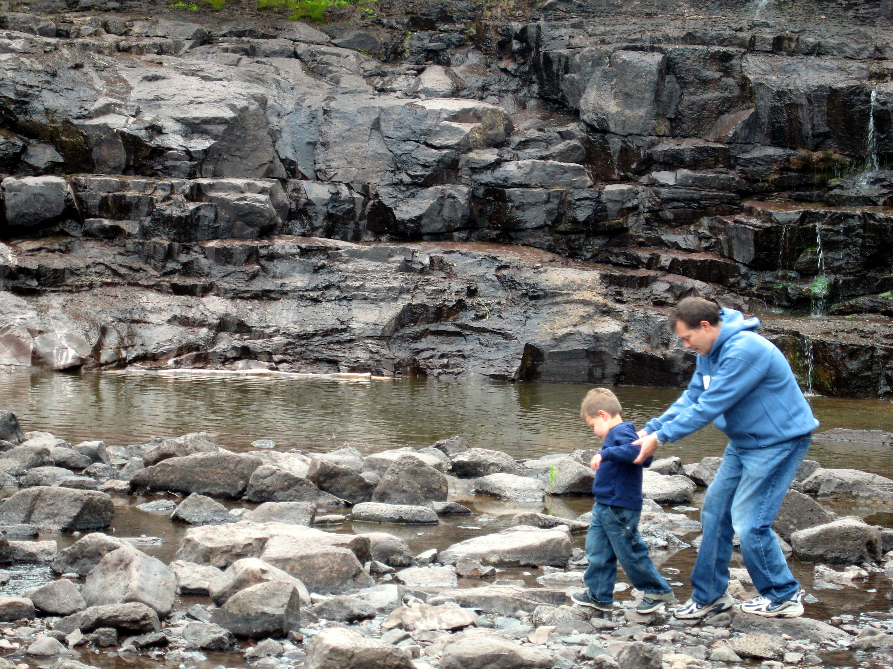Dada helping Punky cross some rocks at Gooseberry Falls.