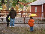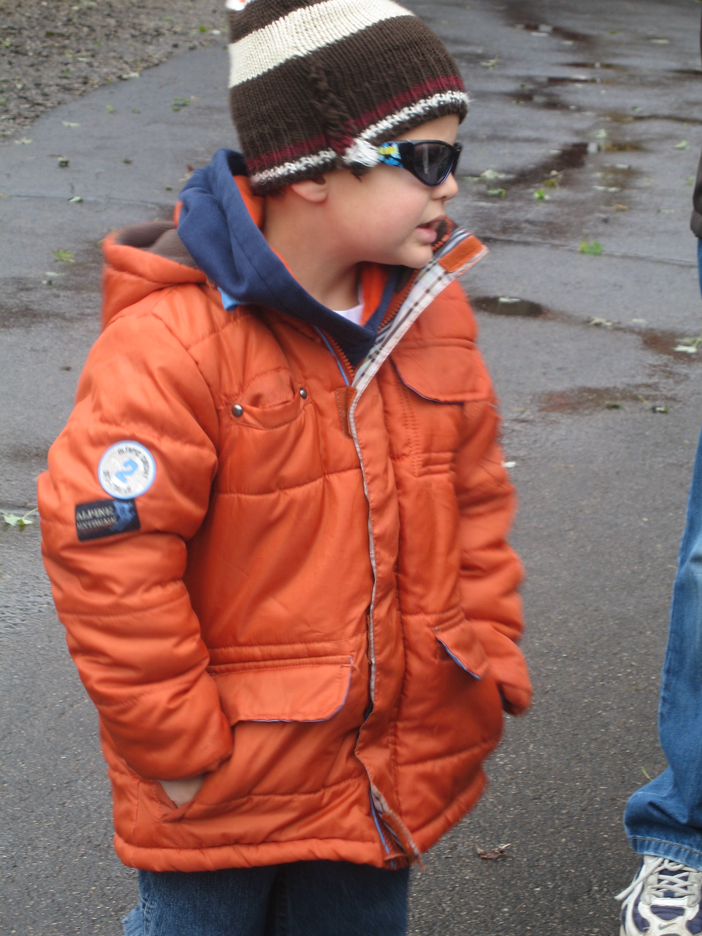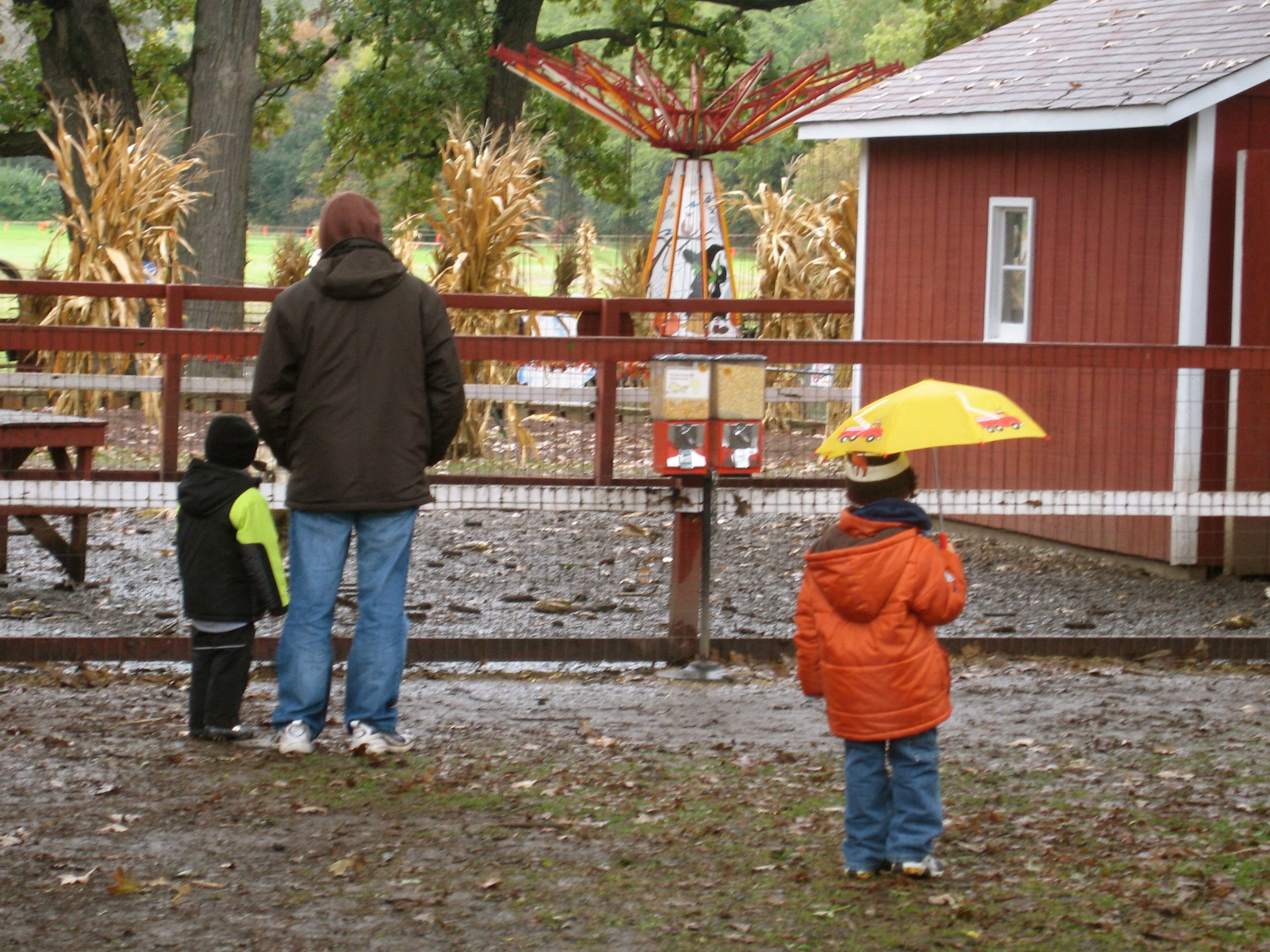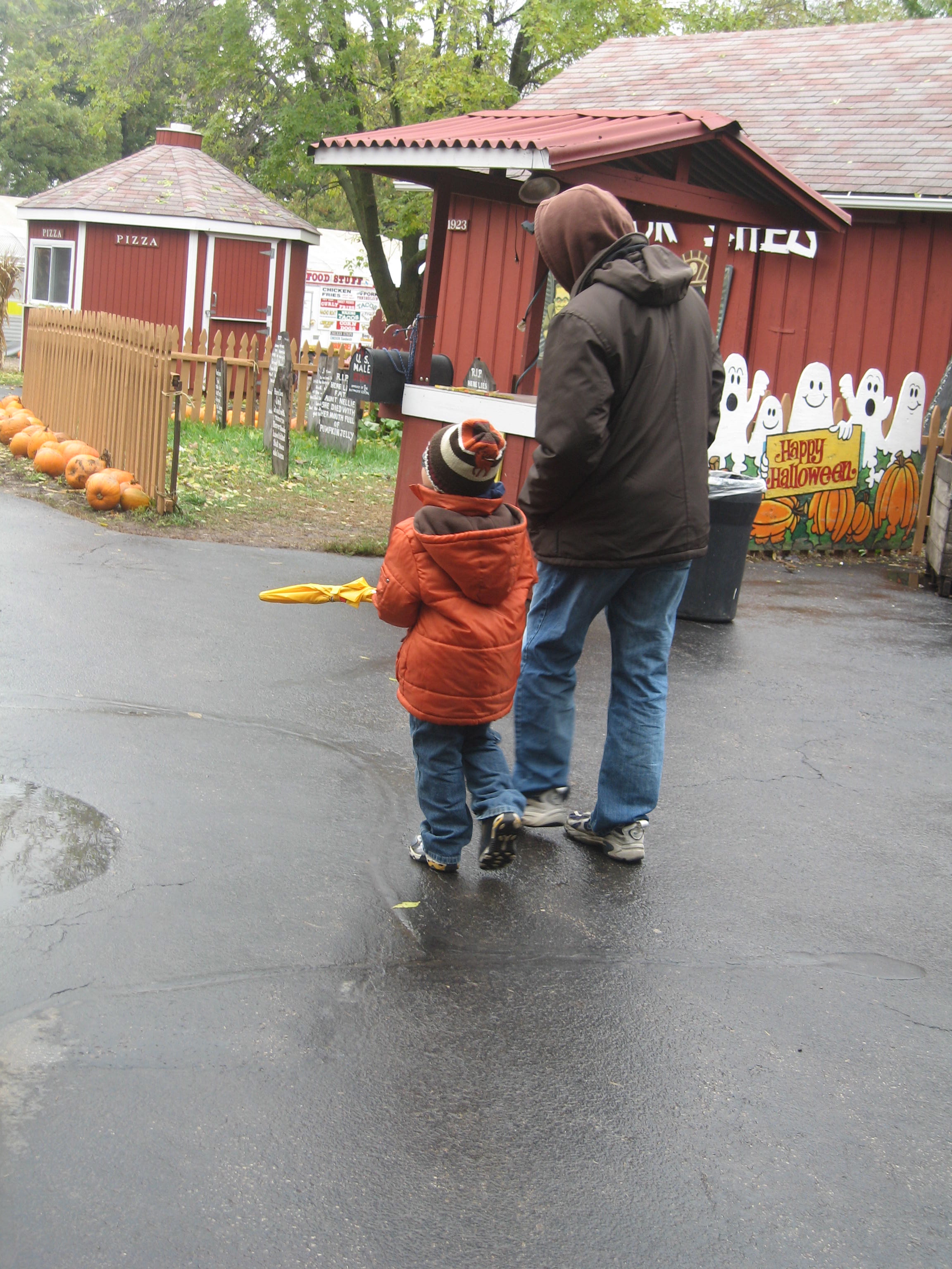 Last Friday, in the rain, we hit the pumpkin patch in Illinois with my sister, her kids and our mom, Grandma Knock Knock. We had fun, but it was cold, damp, and wet. Punky was quite the fashion model. He donned his sunglasses (no sun?), an umbrella, and his winter coat and hat. Here are a few pictures to document our time there! Brrrrrr.