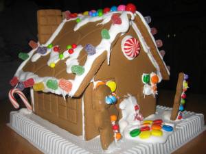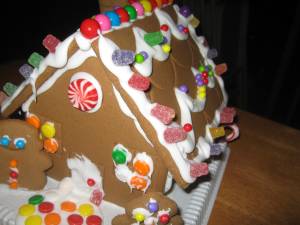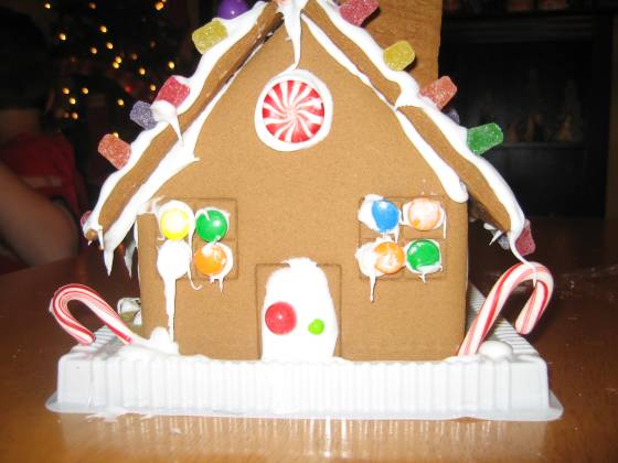 Here are some pictures of our “gorgeous” gingerbread house we made this year. Don’t get too excited. It was a kit I picked up at Target; actually, it was a kit Punky saw on an end cap and pushed it into the cart. I just didn’t feel like fighting that battle….thinking “Oh well, it might be fun!”