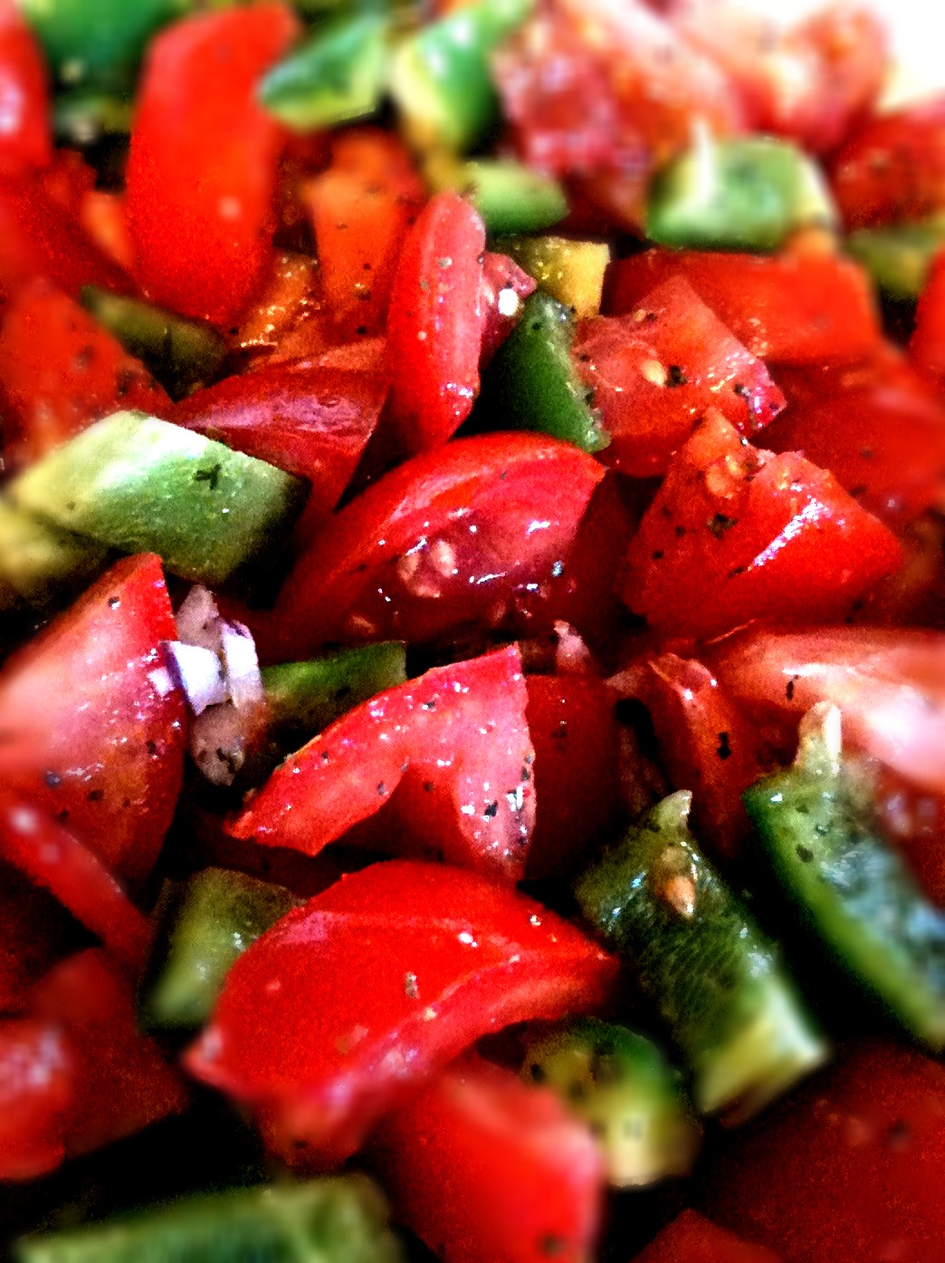 I chop up the tomatoes, red onion , green pepper, and place in a medium size bowl. Add garlic and stir gently. Sprinkle kosher salt, sugar, pepper, and italian seasoning over the top and gently mix. Drizzle olive oil over the top. Let stand 10-15 minutes for flavors to combine. Serve.