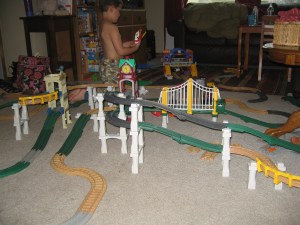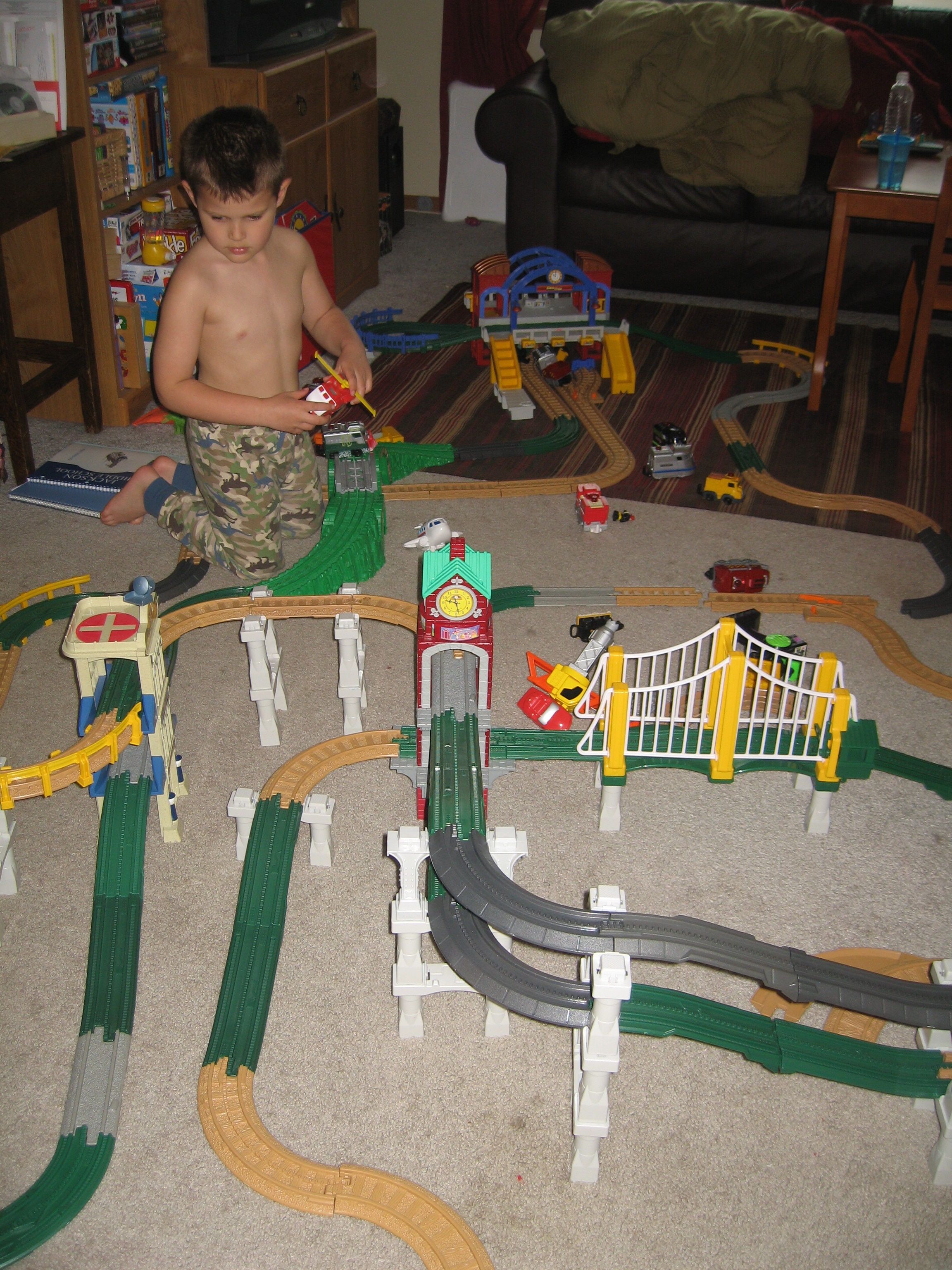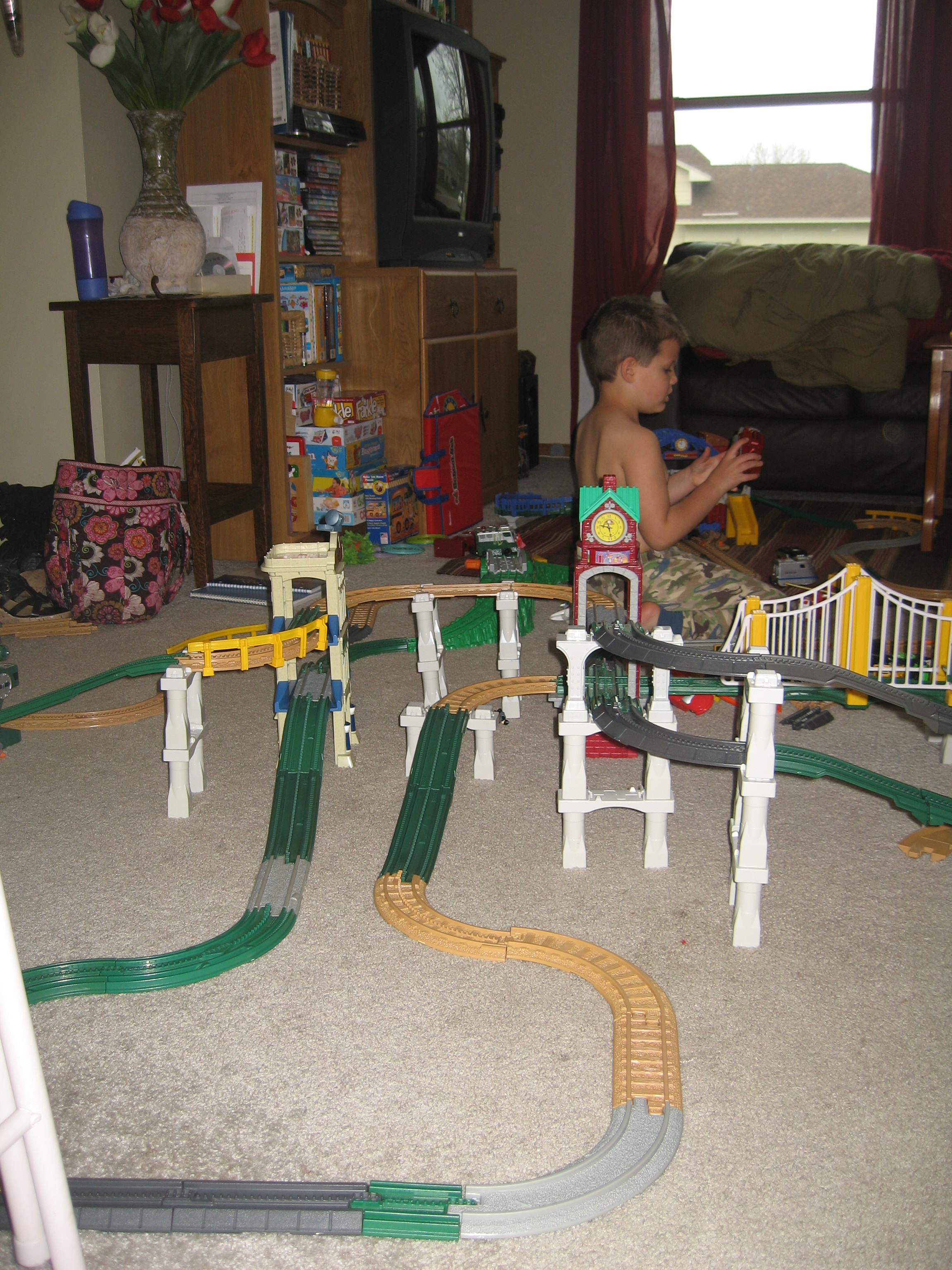 At 11, Punky decided he wanted to build GeoTrax layouts and start playing. So I lugged the huge rubbermaid tubs up from the basement, and a huge Geotrax layout is what we made! He was happy with playing after we ate lunch. I showered, made homemade split pea soup, and did some online shopping. 🙂