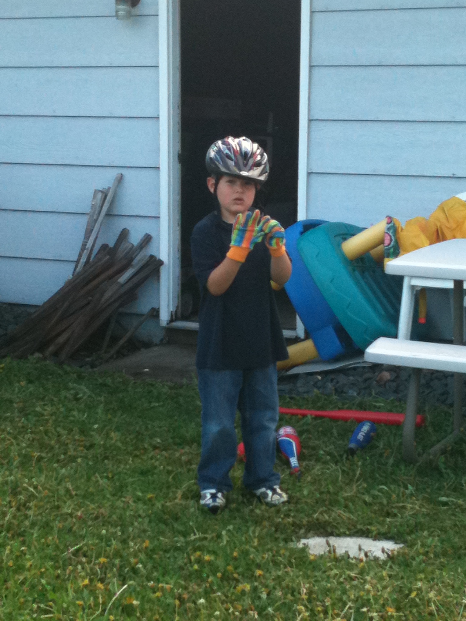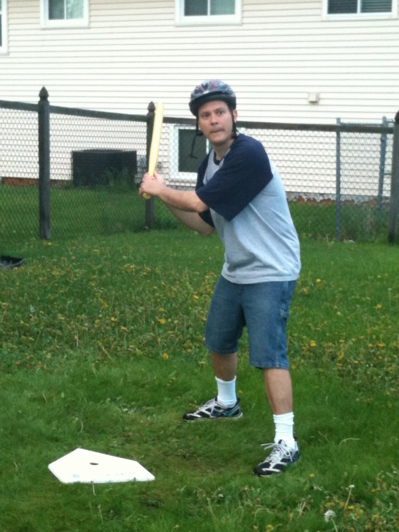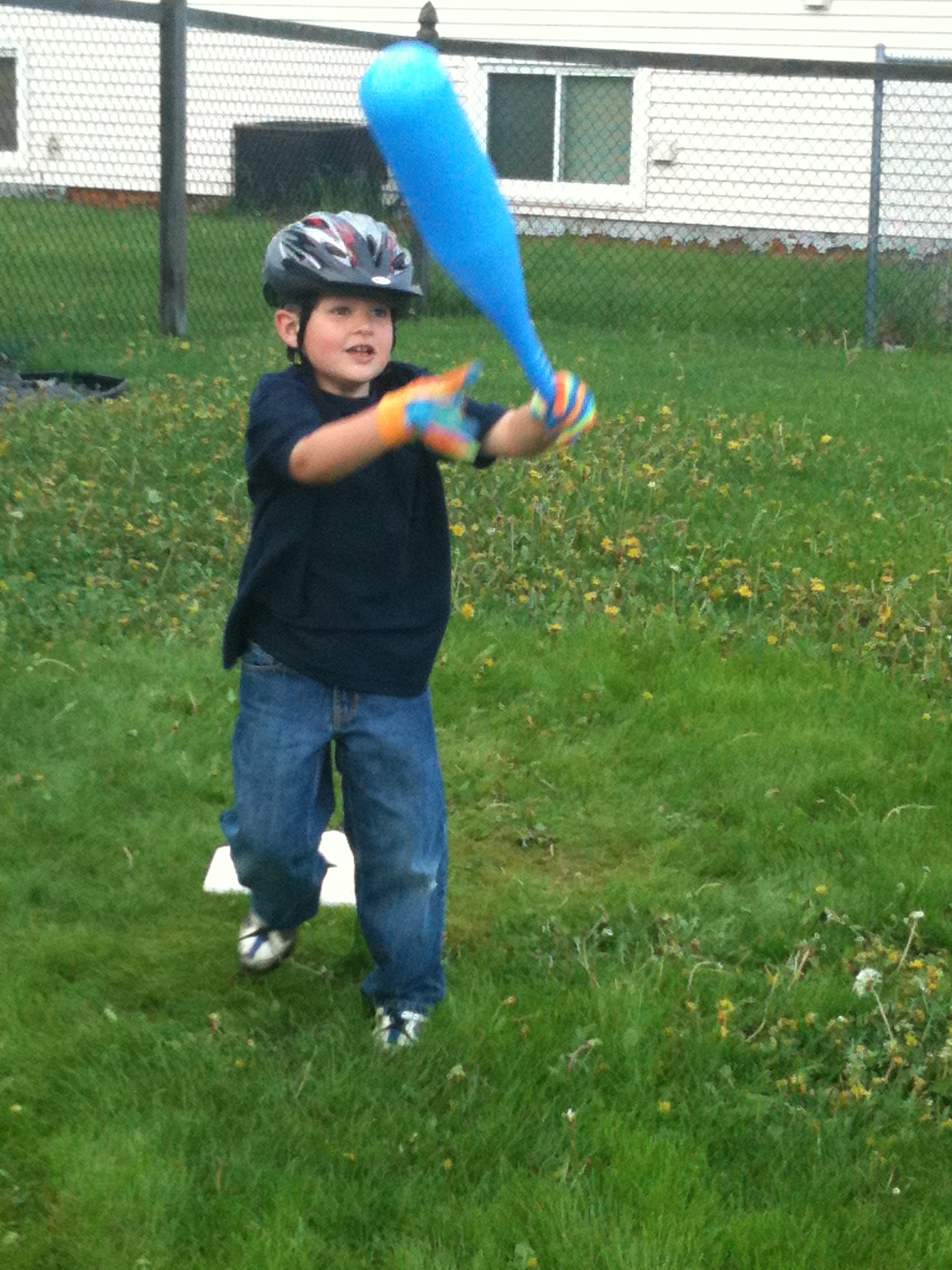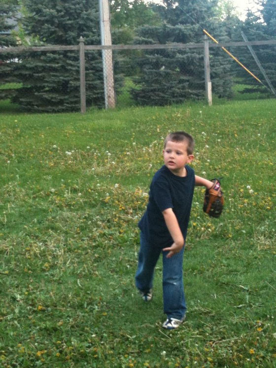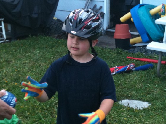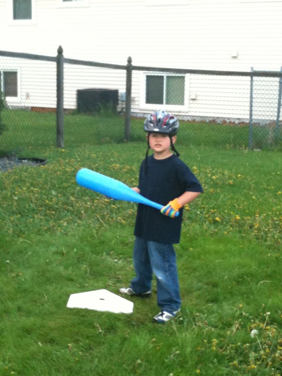 As I cooked dinner, the news was on, and Punky didn’t need to see or hear the aftermath from the storms, so we went out to play “baseball” in the backyard. (Mind you, the amount of rain we’ve had in the past three days has made our yard look like a dandelion jungle! So ignore that part of the pictures!) Punky is soooooo into baseball these days, he pretty much lives, breathes, and sleeps baseball. He watches any games he can get on tv…. listens to the radio for updates on scores, and pretends to play ball all day long….whether inside or out! So, here we are in the backyard….and Punky is so into this game….he wears his Bike helmet as his “batting helmet” and then went to fetch his “gardening gloves” to use as his batting gloves. Man, this was a sight to see! Wow. Only a picture can show you how great this was! Enjoy!
