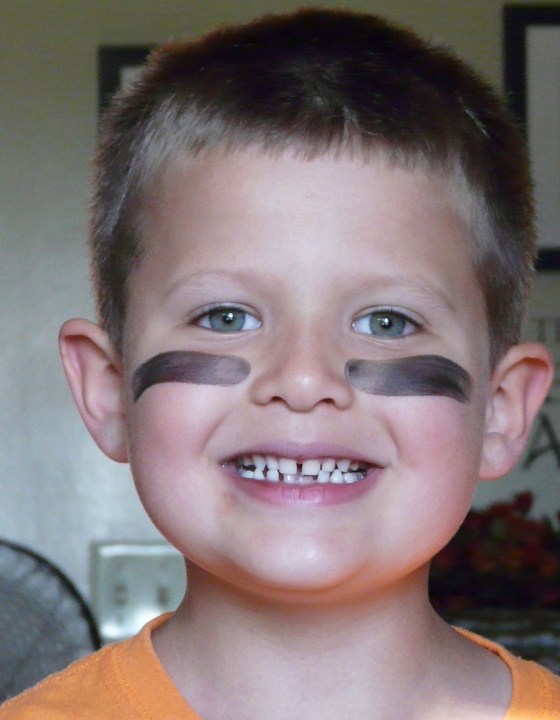 First, the boy saw a tube of that black stuff baseball players use to reduce the glare. He wanted it so badly. I put it on him, and his smile lit up the world!