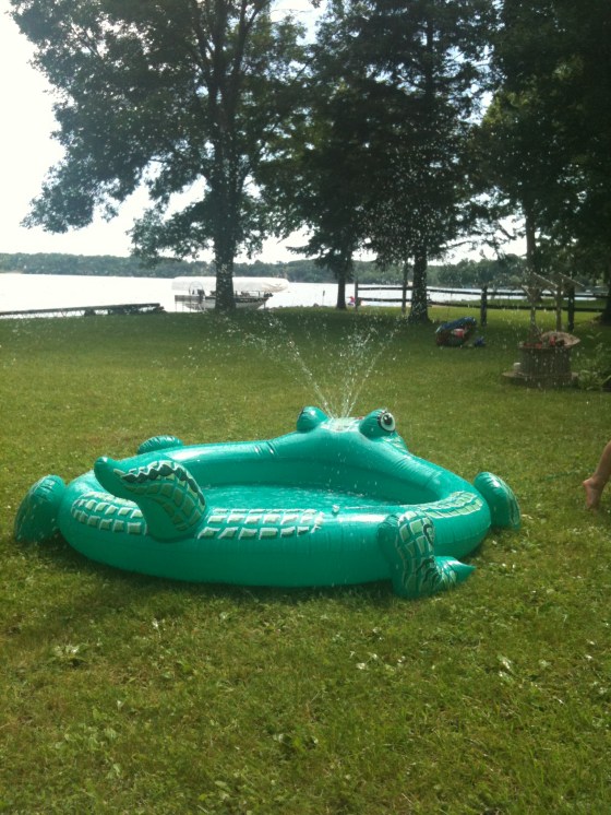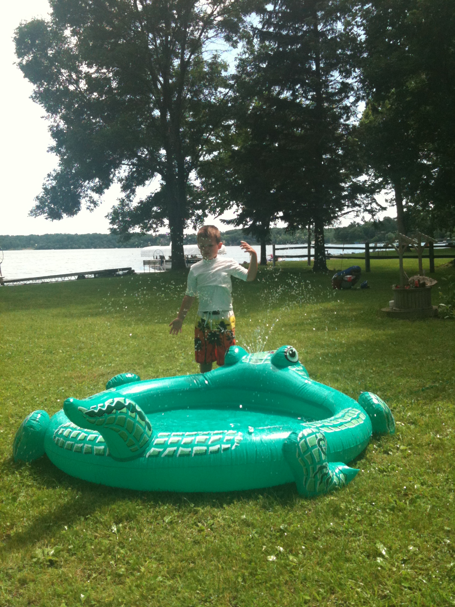 Another awesome buys at Aldi’s. They have these pools that are also sprinklers. Punky has the frog one at home. He’s at the dolphin and shark at Grandma Holly’s, and now we have the alligator one. These pools are less than $10, and they supply a whole summer of fun!