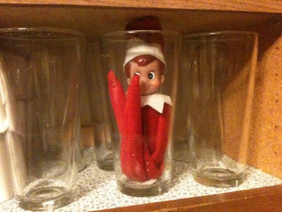 the kitchen cupboards…in a drinking glass! Elfy, you are sneaky!