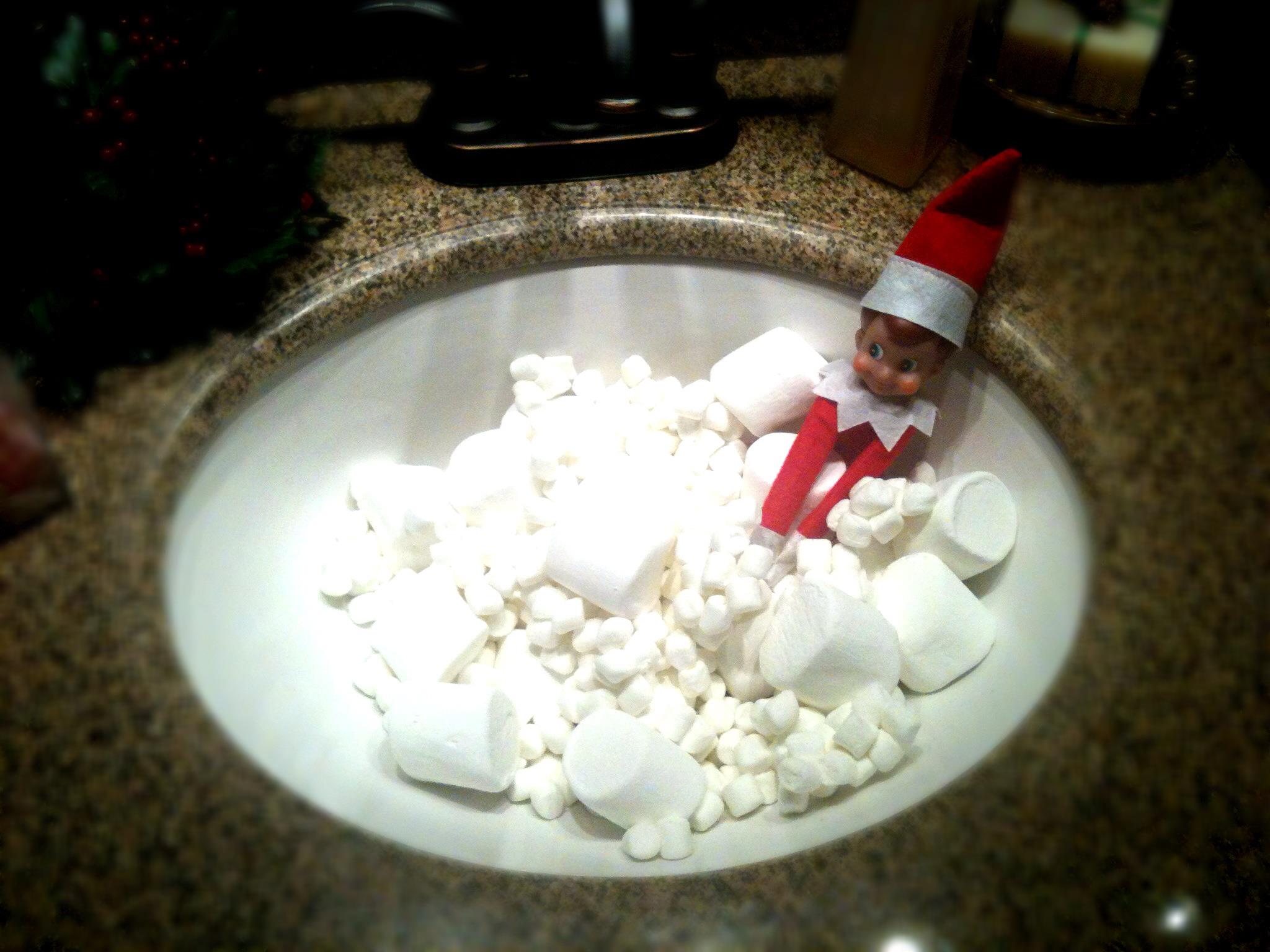 Our last morning there, Elfy decided he needed a bath and we found him in the bathroom sink…in a “Bubble Bath!”