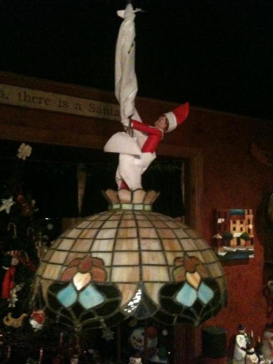 Elfy was a bit mischievous right of the bat while we were in Illinois…day 2 he ended up scaling the lamp above the kitchen table with toilet paper! Crazy Elf!