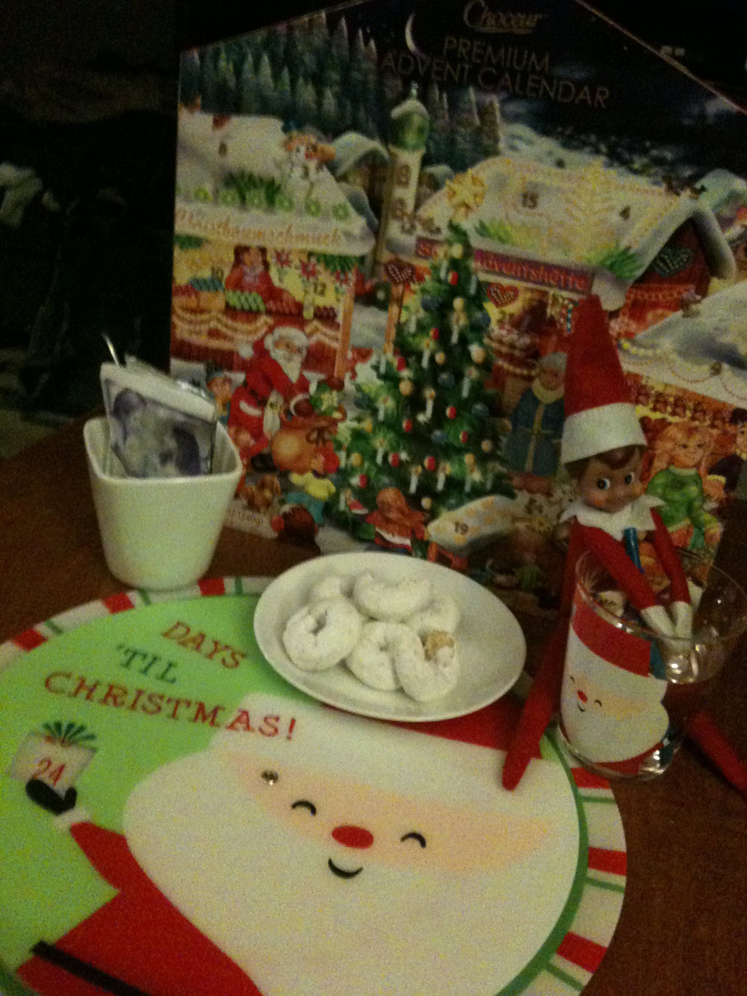 Then, Elfy brought another mini-North Pole breakfast (notice the already bit donuts….bad Elfy!)
