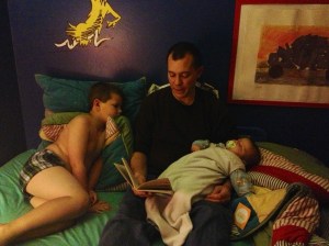 Bedtime storytime at our house. Again, it just warms my heart. Punky loves listening to his daddy’s “radio voice” read each night. Henry also falls asleep listening to it. Tonight’s story: Ramona and Beezus — just 2 chapters.