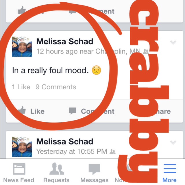 Just started the day off crabby…and I so did not want to go back to work. Just seems like lots of petty things going on there as I sit back and look at the whole picture…my thoughts always come back to Leah and what she’s going through right now as she battles her cancer. (Speaking of…she heads back to the hospital this weekend for another round of chemo and then they start the transplant of those stem cells! Yay!) The picture to the right was my Facebook status this morning…warning the world to stay out of my way.
