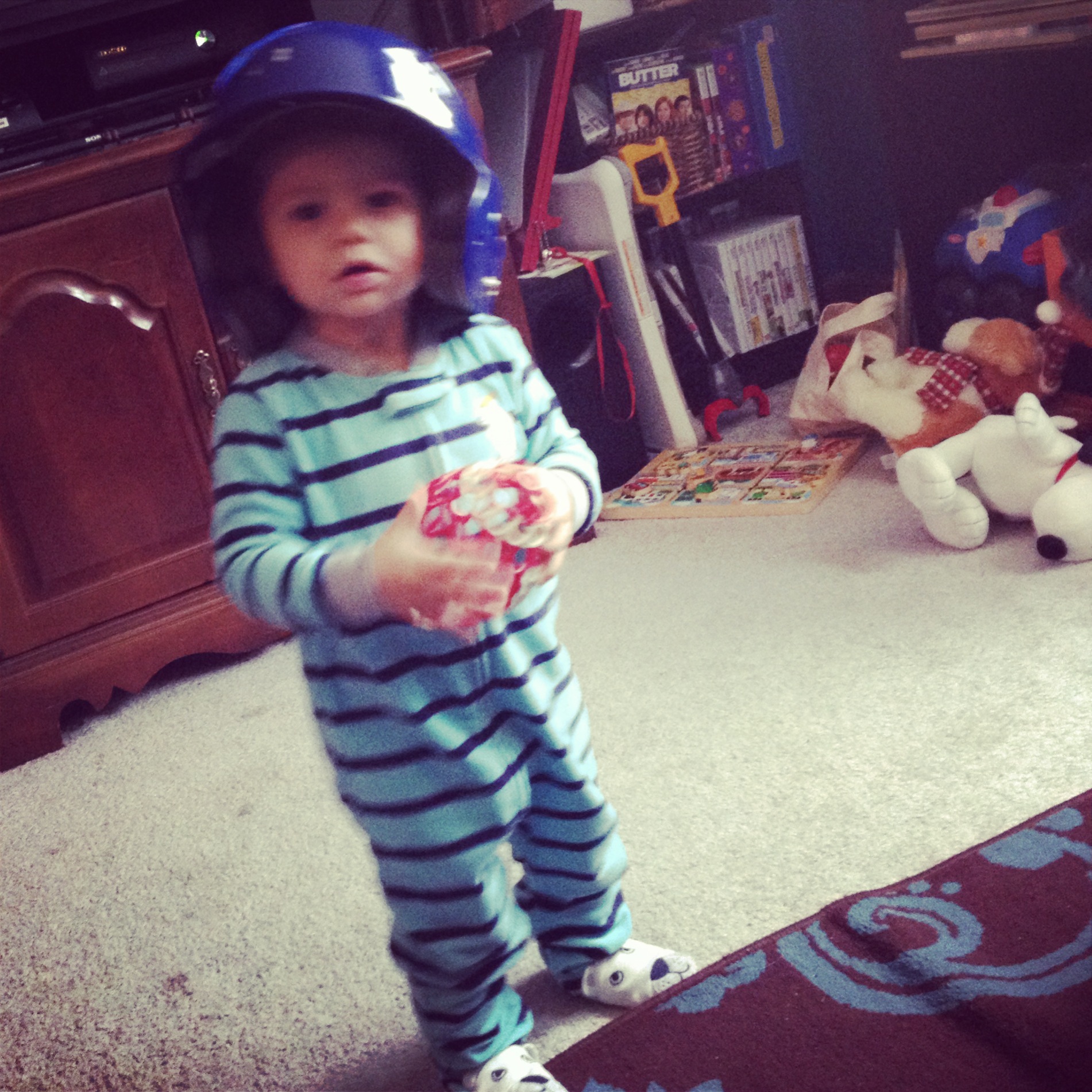 The big boys played Xbox for awhile. Kirby wanted to join them, so he teetered off and grabbed Punky’s batting helmet. He used it as a football helmet, then grabbed his little football and started tossing it to me.