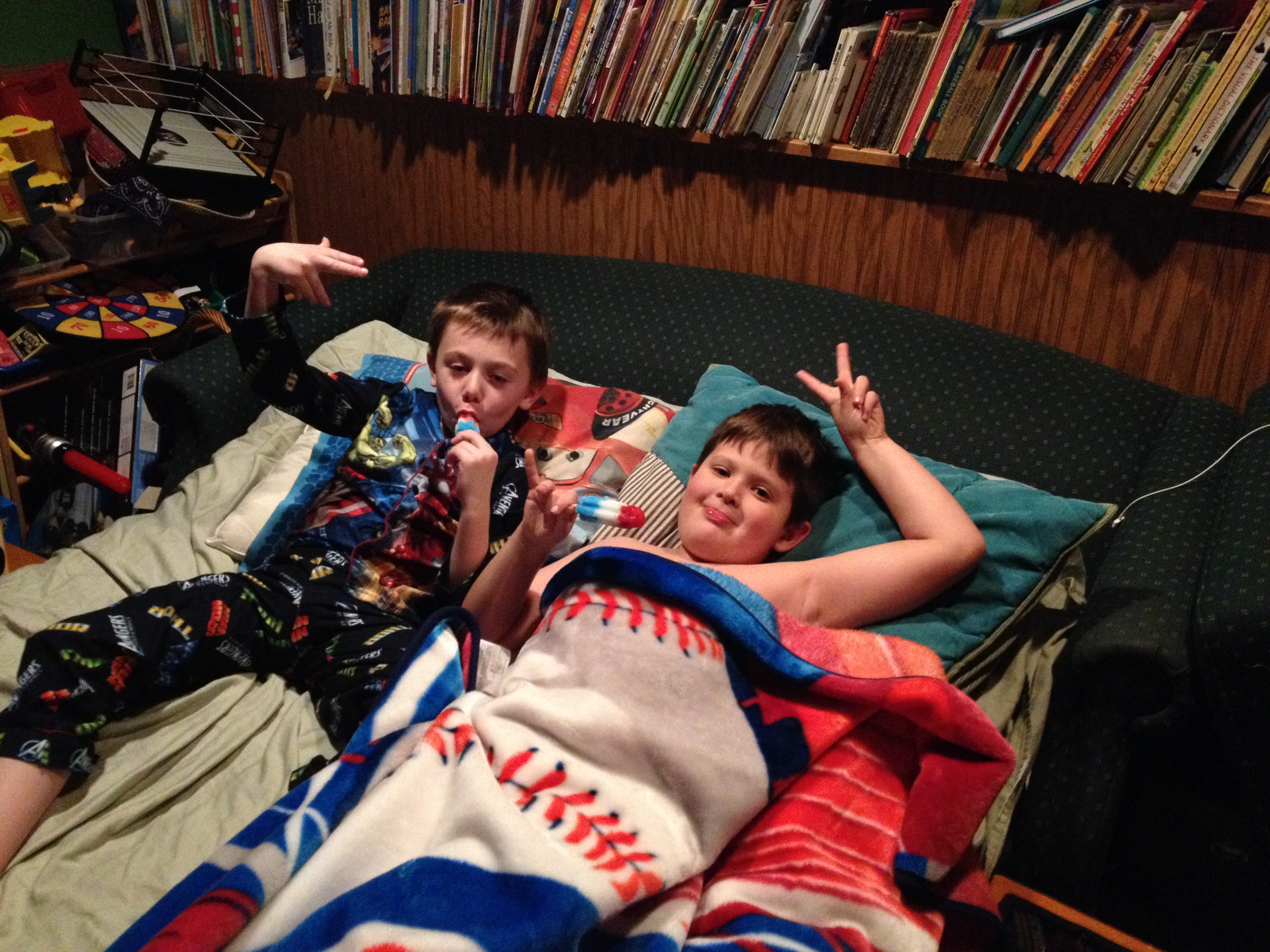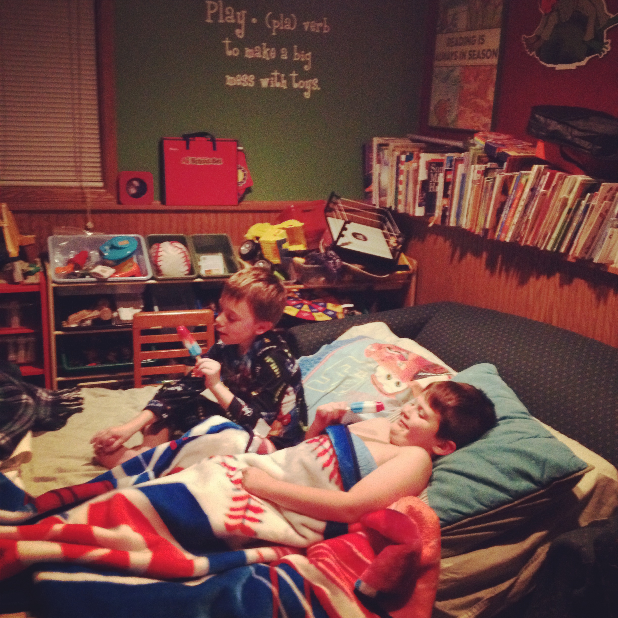 The kids ate pizza from Broadway. Kirby played with Daddy while Mama ran to Target. Kirby got a bath too. Poor kid is fighting some sort of a cold. 😦 When I got home, I snapped these pics of the big boys eating dessert and watching their movie. They were so stinking excited about their sleepover. It was so cute!