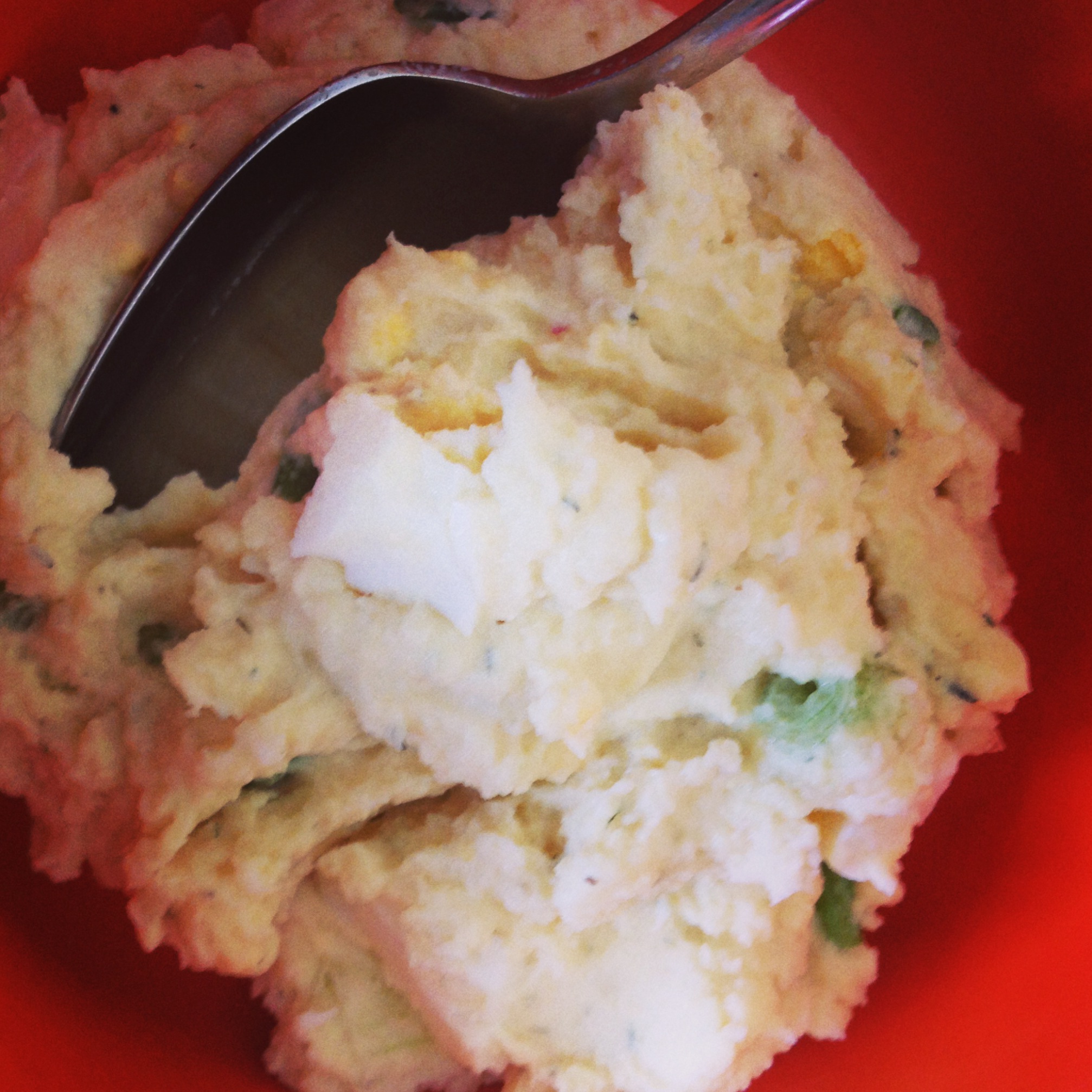 As I set out to make this, I saw that she used a potato ricer. Ahhhh. I had one of those. My Grandma bought me one for Christmas a few years ago, and just recently Kirby pulled it out and had been carrying it around like a toy. So I followed her recipe all except for the sweet pickles since I didn’t have any. It was absolutely delicious. Hubby even emailed me from work today saying that he was thinking about potato salad. Yep, it was that good.