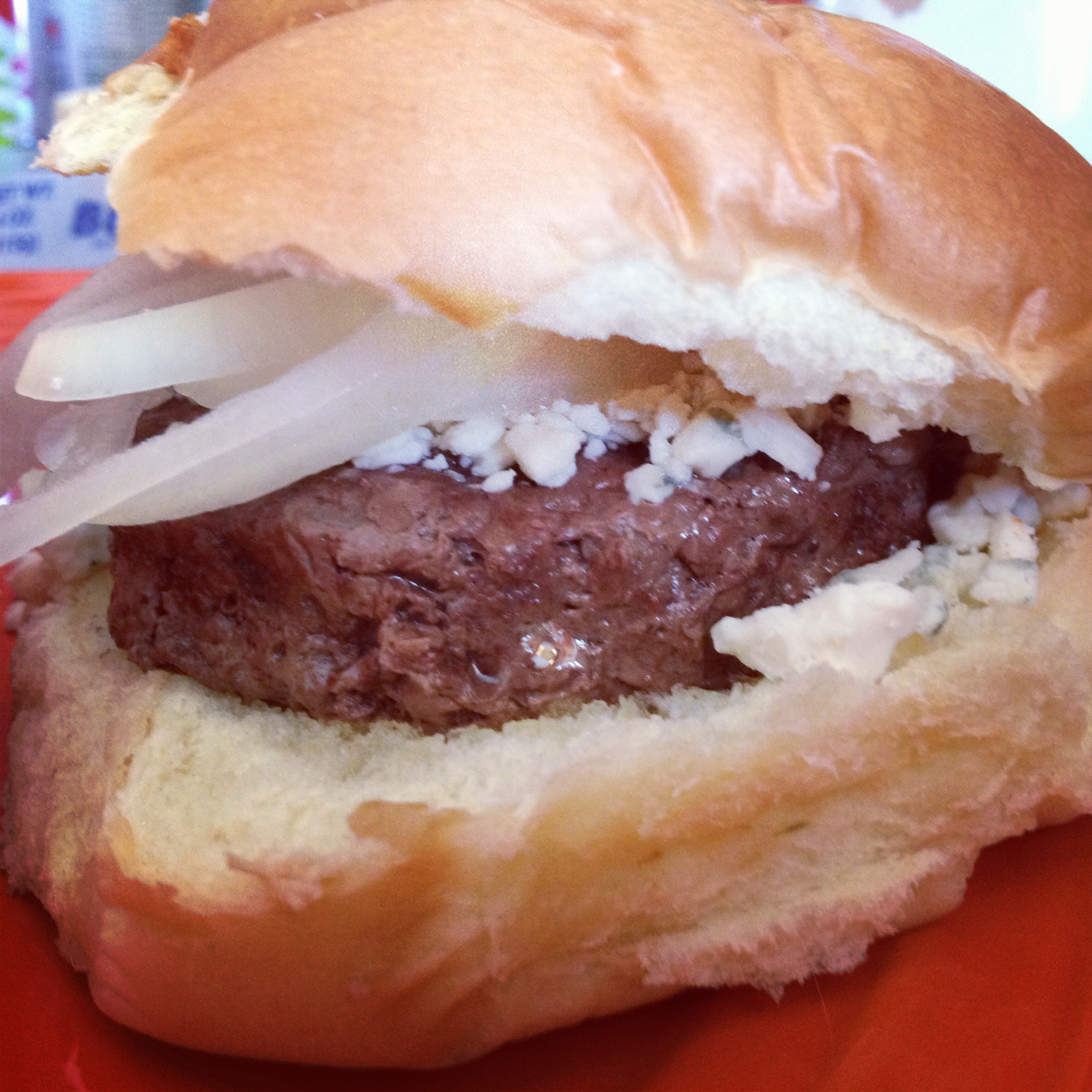 Then, to top off the meal, I made hamburgers, piled them high with crumbled bleu cheese and onion slices.