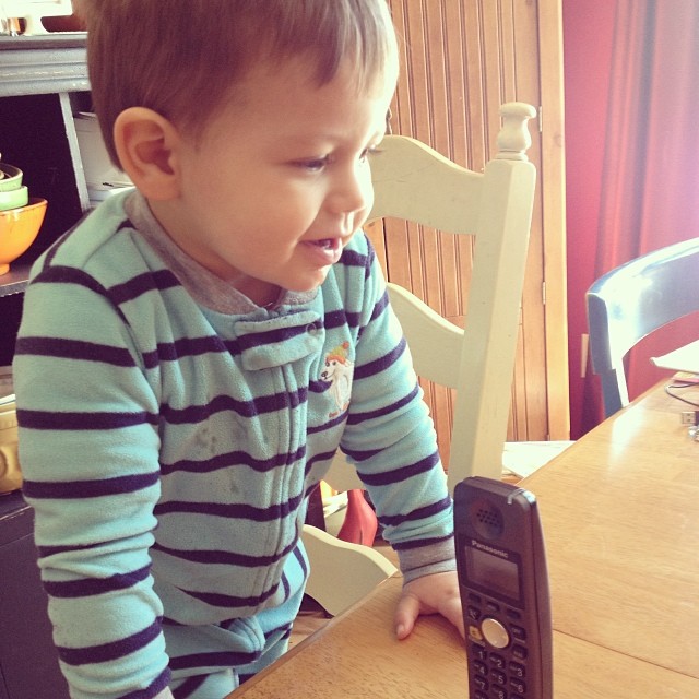 The past two days, Kirby has just been taking off with his “talking.” He just babbles with an occasional “Ball” thrown in there. But, it’s so stinking cute. He just keeps talking like you should know what he is saying. He spent a few minutes the last few days “talking” on the phone to my mom, my sister, and Hubby.