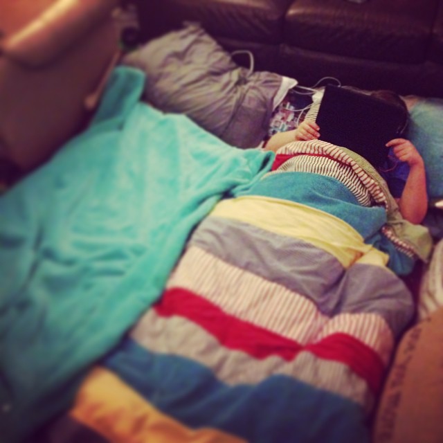 Punky asked me if we could have a special sleepover in the living room tonight since we have no school tomorrow. I obliged. I am fairly certain my back will hate me in the morning, but how could I turn this down? Punky is only going to want to do things with me for so long in his life….