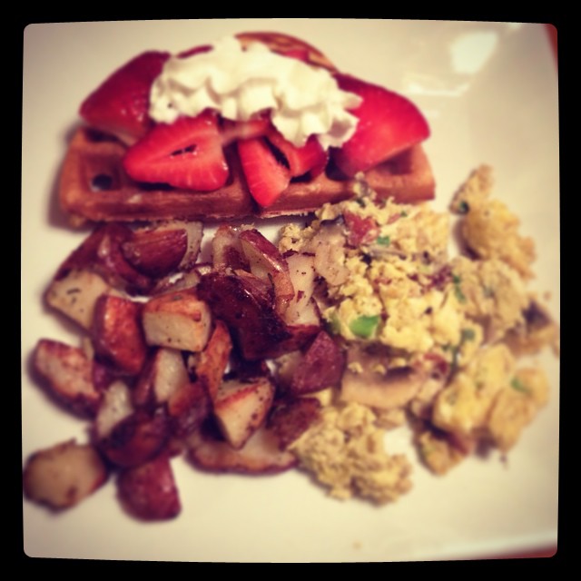 Homemade waffles (just a section of one or two…we’ll split them up as a treat) with Fresh Strawberries and Blackberries and whipped cream