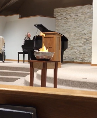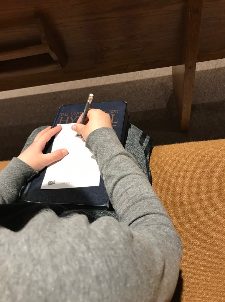 At tonight’s service, Pastor Max had us write out on slips of paper things we were ready to give God so that we could move forward. It was a really moving experience. Both boys also participated – it was heartwarming to see Kirby writing out his little slip of paper. After we put the paper in a bowl, Pastor lit the papers on fire and we watched as our worries and heavy issues were lifted up to God.